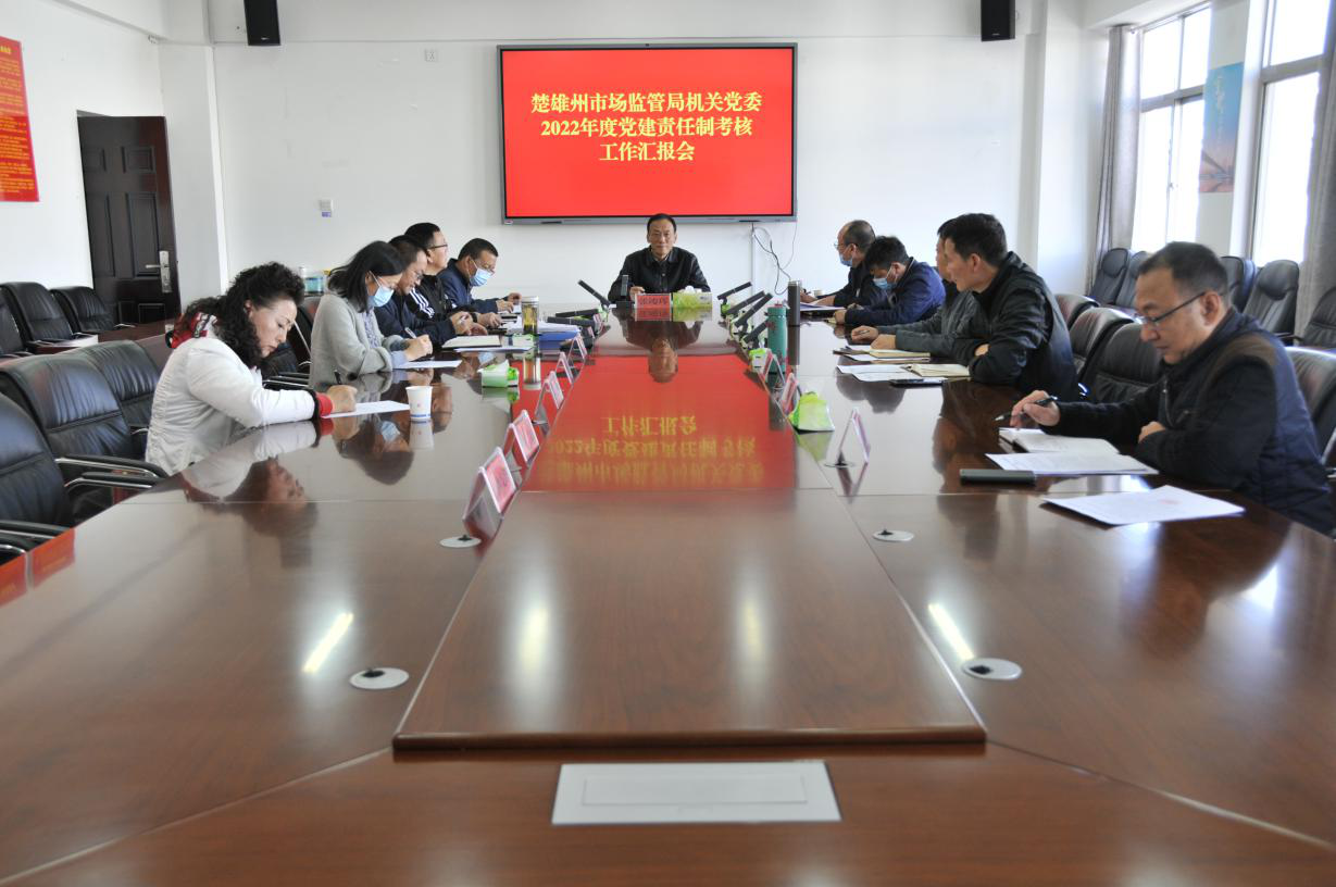 12月2日,楚雄州市场监督管理局机关党委召开2022年度落实党建工作责任制情况汇报会。党组书记、局长、机关党委书记张竣珲同志主持会议。机关党委委员、党支部书记共11人参加会议。